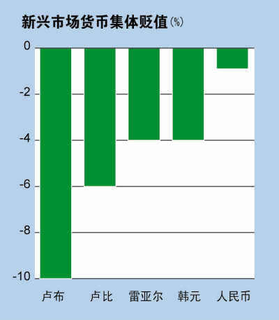 其实,自5月份以来,伴随着美元指数一路大涨,印度、巴西等新兴经济体货币对美元汇率均大幅下挫。5月份俄罗斯卢布兑由美元和欧元组成的一篮子货币汇率下挫超过10%,印度卢比兑美元下跌超过6%,巴西雷亚尔、韩国韩元汇率走弱均超过4%。相比之下,人民币兑美元汇率5月份仅走低0.9%,与其他新兴经济体的货币相比表现相对稳定。
