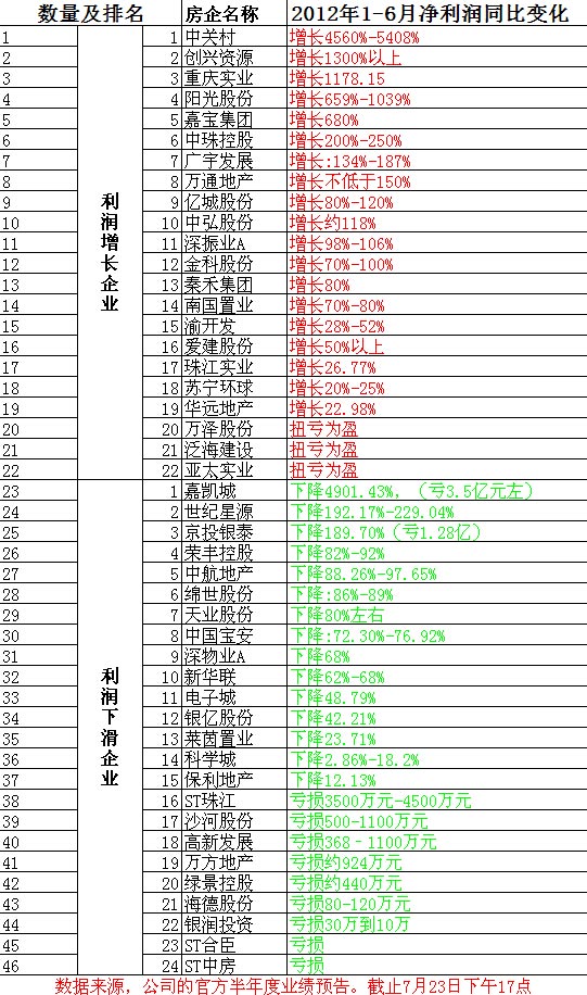 中国经济网7月25日讯 随着国家在房地产市场持续调控,给房地产业带很大冲击。目前沪深上市房产中,已统计到46家房产企业以快报或预告等形式,发布了上半年利润情况。数据分析显示,有24家房产企业的利润出现不同程度的下滑或亏损态势,仅22家房企的业绩出现增长。