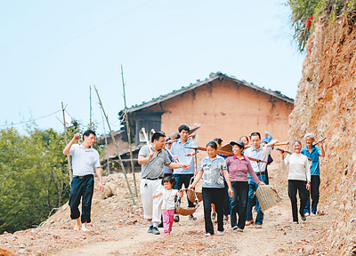 2010年12月起,赣州市组织2.3万多名干部深入基层,开展“送政策、送温暖、送服务”工作。图为兴国县“三送”干部带领枫边乡石印村山阳寨村民修路。 |