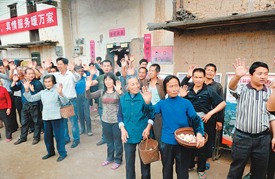 4月10日至16日,国家部委联合调研组深入赣南苏区实地调研。图为瑞金市叶坪乡黄沙村华屋群众自发来到村口迎接北京来的亲人。 |