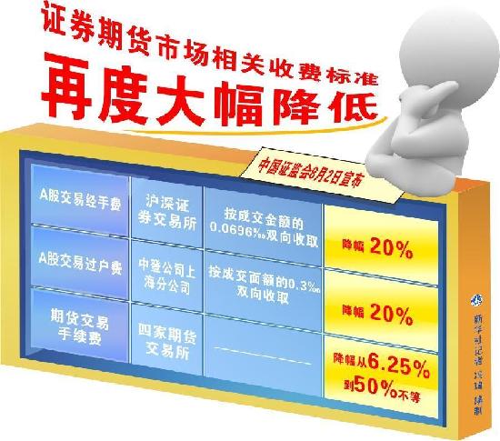 继年内先后两次较大幅度降低交易手续费和市场监管费后,证监会2日下午透露,沪深证券交易所、中国证券登记结算公司和四家期货交易所联手,将再次大幅度降低A股相关交易手续费,沪深交易所费用整体降幅为20%,调整后的收费标准将从9月1日起实施。