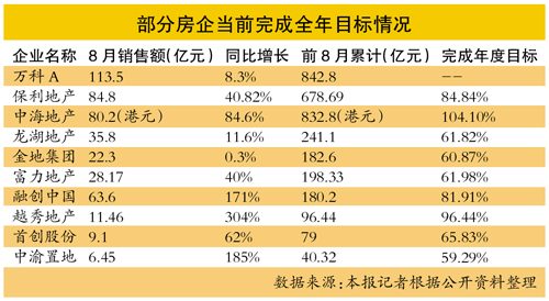 “但销售较好的主要是大型开发商,他们受到调控的冲击相对较小。”某开发商负责人表示。而记者对比上述企业销售数据发现,截至8月末,并非每个开发商都能按比例完成销售任务。剔除没有明确年度销售目标的万科,今年前8个月销售超过全年67%的公司仅有7家,占比46.67%。