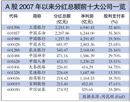 证监会提供的数据显示,A股上市公司的股息率2011年达到1.82%。其中蓝筹股的股息率明显较高,沪深300的股息率也从2008年的1.29%上涨到2011年的2.34%,而2011年美国标普500的股息率也仅为2.12%。