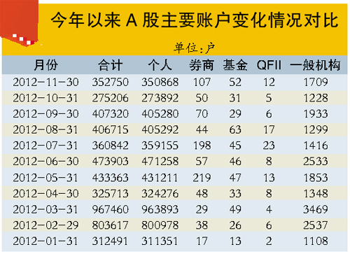 记者对比发现,在这些超级大散户撤离的同时,机构们却显得积极。11月份,包括保险、QFII、券商、基金和信托在内的主力机构新开炒股账户环比翻番。业内人士分析指出,2012年只剩下一周左右的交易时间。这些主力疯狂开户应该是押注2013年A股表现,而从目前机构态度看,2013年市场回升的概率较大。