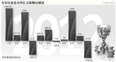 央行上周末发布的数据显示,相较10月份,11月外汇占款减少736.23亿元,单月减少量创今年以来纪录。专家认为,外汇占款如此大的负增长“有蹊跷”。