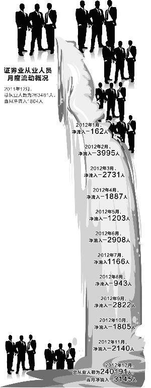 值得注意的是,虽然2012年12月股市行情回暖,但当月人员流出速度并未放缓。据伟海数据统计显示,去年人员流出最高峰在2月,当月人员净流出3995人,其次则为去年12月,当月净流出3145人。去年四季度,人员净流出加快,其中,10月净流出1805人,11月攀至2140人,12月则超过3000人。