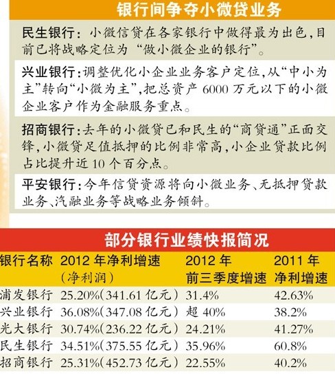 这也就意味着在同业业务上较为出色的兴业银行,今年将加入与各家银行争夺小微企业信贷的行列。兴业银行披露的数据显示,2012年该行小企业客户数全年增幅近40%