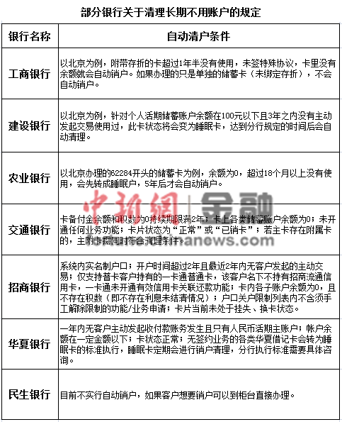 银行对于长期不用账户的注销规定不同,为了便于消费者了解清户条件,以免造成用卡不便,中新网金融频道咨询了国有银行和部分商业银行的相关规定。