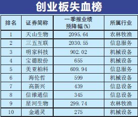 2011年、2012年的业绩表现不尽人意,今年一季度的业绩预期同样难以给人期待。据本报数据中心统计,在355家创业板公司的一季报预告中,透露“预增”、“续盈”、“扭亏”、“略增”等预喜信息的只有215家,而表示“首亏”、“续亏”、“预减”等预忧信息的公司达140家,占比高达39.44%。2012年4月25日才上市的天山生物,更是交出了“预计净利润同比下滑2095.64%”这一令人瞠目结舌的预忧报告。而2012年一季度创业板上市公司的业绩报忧率只有30.63%。