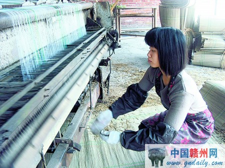 在江背镇一席草加工企业内,工人正在操作席草编织机。
