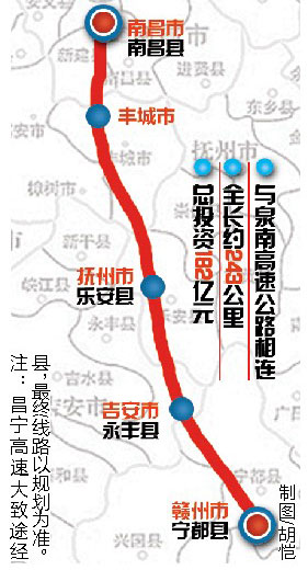 据悉,昌宁高速北起南昌市南昌县,途经丰城市、乐安县、永丰县,南至赣州市宁都县与泉南高速公路相连,全长约243公里,总投资182亿元;昌栗高速东起南昌市新建县,西至萍乡市上栗县与浏阳至上栗高速相连(尚未最终确定具体线路),全长约221公里,总投资110亿元。