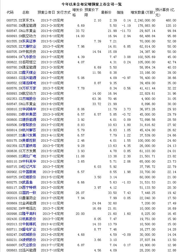 继招行抛出285亿再融资方案之后,京东方连夜再抛约460亿元巨额融资方案,引起市场一片哗然。事实上,虽然IPO暂停、市场走势羸弱,但年初以来仍有82家公司发布定向增发预案,计划募资总额2259亿元。而去年同期仅有三家公司发布约36亿元的定增预案,今年较去年的猛增程度可见一般。