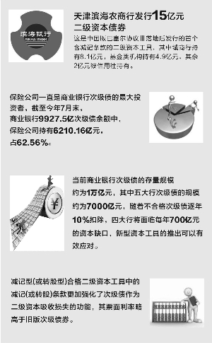 此次天津滨海农村商业银行发行的二级资本债券为《商业银行资本管理办法(试行)》今年1月1日开始实施以来,商业银行发行的首只合格二级资本工具。按照《商业银行资本管理办法(试行)》规定,今年1月1日起,商业银行必须发行含减记或转股条款的合格二级资本工具,否则被视为不合格资本工具,不得计入监管资本,无法提高资本充足率。