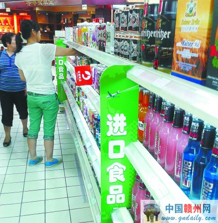 当日上午,记者走访赣州中心城区国光、大润发等超市后发现,这些大型超市几乎都设立了进口食品专区。在国光超市红旗店的一处零食货柜区域,二三十种不同的进口食品摆放在超市醒目位置,食品包装上的外文格外吸引消费者的目光。据该超市一位销售人员介绍,刚开始只有几种进口食品,现在品种多了起来,虽然销量不像国产食品那么大,但是与以前相比已经多了不少。