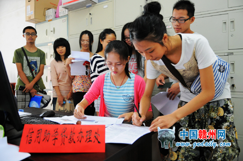 这是日前全南县教育局工作人员正在为大学生办理生源地信用助学贷款手续。为解决贫困大学生的学费难题,全南县设立了学生资助管理中心,通过“一站式”服务平台有序办理助学贷款手续。