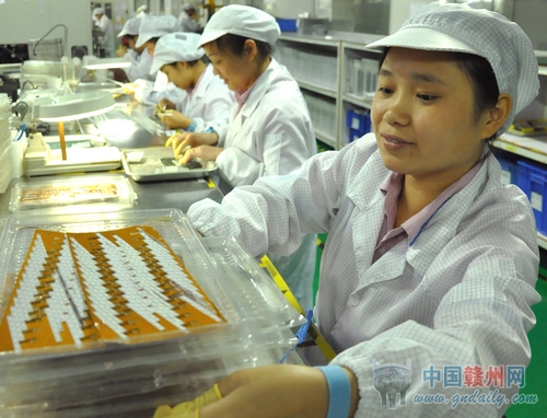 日前,记者走进位于信丰县城北郊的信丰工业园,在近1.2万平方米的江西聚声泰科技有限公司生产车间里,29条流水生产线高速运行,1200余名员工各司其职。