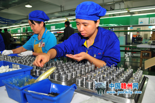 近日,工人在上犹县乐丰电机(赣州)有限公司生产车间忙碌。该公司自主研发具有稀土强磁、变频驱动等先进技术的电机产品远销国内外。据了解,该县结合赣南苏区振兴发展规划,找准工业发展切入点,加快工业结构调整,着力打造玻纤及新型复合材料和模具机械制造两大主导产业“航母集群”。