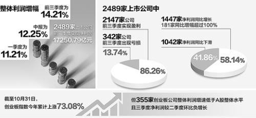 截至10月31日,沪深两市上市公司三季报披露完毕。Wind资讯统计显示,已公布三季报的2489家上市公司前三季度实现净利润17250.79亿元,与去年同期相比增长14.21%。其中,2147家公司前三季度实现盈利,占比86.26%。