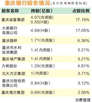 昨日重庆银行上市后,香港大新银行认购重庆银行H股约5500万股,这样,在不行使超额配售权的前提下,占发行后总股本26.9亿股的17.05%。同样,重庆渝富也认购重庆银行H股约5500万股,这样,重庆渝富在重庆银行H股上市后,仍为第一大股东,占总股本17.16%。
