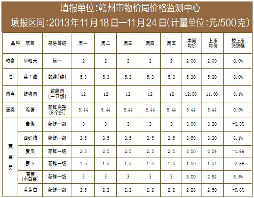 上周(11月18日至11月24日),我市各类食品价格涨跌互现,整体稳中趋降。据市物价局监测数据显示,31种城市食品零售价格与前一周相比,6个品种的价格上涨,10个品种的价格下跌(集中在蔬菜类),其余15个品种的价格持平,价格下降与持平的品种占80.6%。