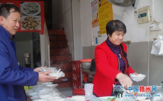 “宁都肉丸用料讲究,多少肉放多少粉,都得用秤称好,放多了做出来的韧度不够,放少了黏结性又不好,容易散开不成形。”陈爱秀说,哪怕是在生意最差的时候,她都要保持肉丸的质量。每天凌晨,丈夫到菜场去买回新鲜瘦肉,她则生火烧水,肉买回来后将肉剁成肉末,一斤肉加入三四两的红薯粉,调配好后下沸水煮成丸子。她的肉丸之所以好吃,除了肉好料足外,卖的时候是用大骨汤熬煮的配汤,鲜美营养。而且,拌食所用的辣椒酱也是按客家的传统方法秘制而成,风味独特。付出总有回报,在赣州市区的宁都老乡们争相来吃陈爱秀的宁都肉丸,就这样,一个带一个,她的肉丸终于做出了名气。