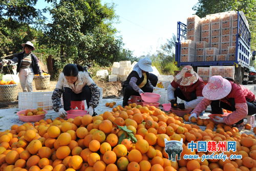 12月4日,寻乌县晨光镇的果农在采收脐橙。该县全面加强果业科技攻关,抓好果品苗木繁育体系建设,着力推广无公害标准化生产,建设了一批专业化、规模化、标准化的新技术示范园和现代果业示范区。目前,该县已建成5个现代农业板块、6个现代科技农业示范园和60个“一村一品”示范区,现代果业面积达30万亩。陈慧明 记者郭芷汇 摄