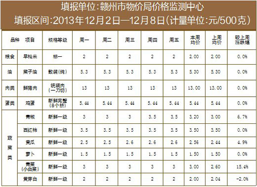 上周(12月2日至12月8日),我市各类食品价格涨多跌少,整体仍以稳为主。据市物价局监测数据显示,31种城市食品零售价格与前一周相比,6个品种的价格上涨,5个品种的价格下跌(集中在蔬菜类),其余20个品种的价格持平,价格下降与持平的品种占80.6%。
