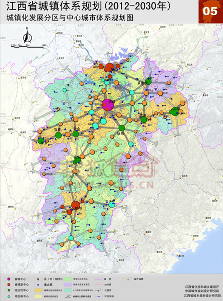 全省范围内形成由区域中心、地区中心、县(市)域中心、一般镇、村庄等构成的城乡居民点体系。省域中心城市为南昌(含南昌县、新建县),省域副中心城市为九江(含九江县、瑞昌市、湖口县、星子县)和赣州(含南康市、赣县、上犹县)。地区中心包括地区性中心城市和地区副中心城市两类。地区副中心城市包括瑞金、龙南等城市。县(市)域中心包括县(市)域中心城市和重点镇两类。