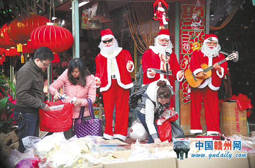 伴随着圣诞节的临近,不少商家嗅到了商机,大搞促销、优惠活动,一年一度的圣诞商战拉开帷幕。12月23日,记者走上街头,提前感受了虔城多样的圣诞气息。