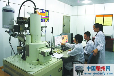 图为崇义章源钨业股份有限公司的工作人员在操作检测中心先进设备——场发射扫描电镜