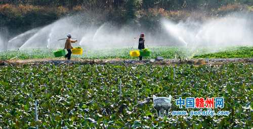 1月6日,全南县中寨乡田新生态农业种植基地的菜农们在挑运蔬菜。该县发挥生态优势,推广生物农药技术,使用无污染有机肥种植的高山绿色蔬菜俏销珠三角地区,年产值超3亿元。钟炆秦 摄
