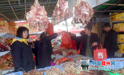 近日,许多市民在赣南贸易广场中心街选购腊货。记者发现,今年腊货市场提前打响了价格战,多家腊货特产品牌主动降价促销,裸装腊货受市民欢迎。