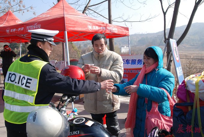 陈先生在1月16日5点带着妻儿开启返乡之旅。上午10时,他的摩托车刚一停靠,现场交警就面带微笑招呼他们进服务点坐下喝碗热茶,并且热情地端出花生等食物让他们品尝。交警还适时送上交通安全提示卡,在嘘寒问暖的同时,提醒注意道路安全。