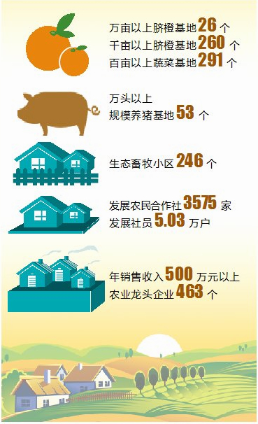 记者连日采访了解到,近年来,我市围绕打造世界最大的优质脐橙产业基地、全国重要的特色农产品深加工基地、面向东南沿海和港澳地区优质农产品供应基地三大基地,积极发展现代农业,加快推进城乡发展一体化,全面落实强农惠农政策,加快推动农业产业转型升级,不断创新体制机制,农业产业发展亮点频现。特别是脐橙等特色产业成为农民增收的“聚宝盆”,新型农民经营主体成为现代农业的“活力因子”,现代农业示范园建设高歌猛进,农业标准化水平进一步提升。