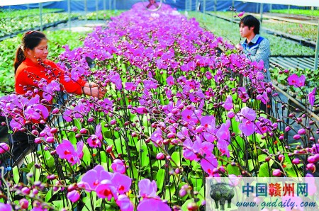 连日来,在全南县南迳镇热水村蝴蝶兰基地内,采用地热资源培植的“红太阳”“彩霞”“彩云”等十几个品种的蝴蝶兰争奇斗艳,成为春节前花卉市场的主打产品。目前,近百万盆蝴蝶兰已被各地的花商和市民订购一空。钟炆秦 周晓雄 摄