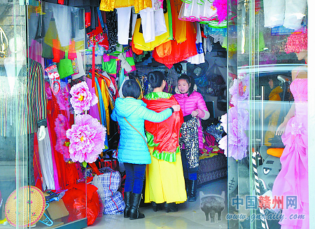 1月18日下午,钟美娇的店内十分热闹,顾客一拨接着一拨。这些人大多为了节日演出服而来,他们有男有女、有老有少,或打听、或试穿、或取货。顾客中,有2个长相标致、身材纤细的女孩十分显眼。记者和她们交流后得知,她们是赣州某医疗器械公司的职工,春节前,她们公司将举行文艺活动迎新春,她们代表公司来预租演出所需的服饰。