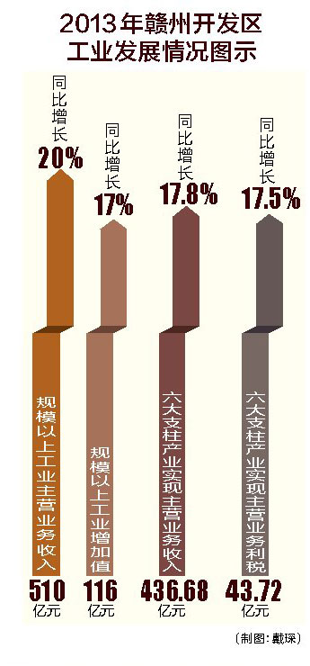 围绕六大主导产业,主攻重大项目,集中培植一批产业链完善、规模效应明显、核心竞争力突出的产业集群,拉动经济总量持续攀升。2013年实现生产总值160亿元,主营业务收入达528亿元,六大支柱产业实现主营业务收入436.68亿元,同比增长17.8%,占赣州开发区工业总量的82.7%。