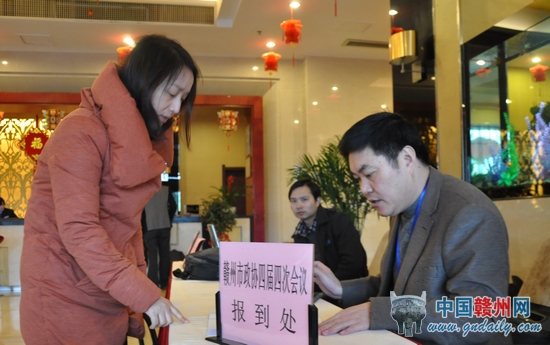2月9日下午,出席赣州市政协四届四次会议的委员们来到大会报到处报到。