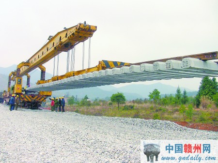 2月11日上午9时,在大余县南安镇梅山村,随着中铁十局铺架公司现场指挥的哨声,铁轨从铺轨机中徐徐伸出,缓缓落在铺好渣石的路基上。这标志着赣韶铁路项目铁轨铺设工作进入我市。