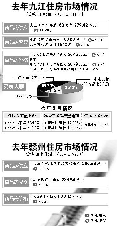 据了解,2013年底,九江市中心城区商品住房可售房源面积172.76万m2、16045套,按2013年成交量推算,房源可满足一年的成交量;赣州市中心城区商品住房可售面积132.07万m2,为历史最高位。商品房库存较充裕,市场预期较稳定。