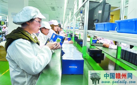 定南县英唐电子科技有限公司工人对一批准备销往俄罗斯的电子书进行包装。(资料图片)黎桥洲 摄