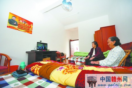 瑞金市沙洲坝镇洁源村敬老院的老人在房间看电视。