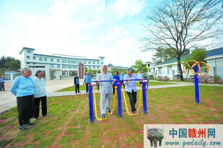 改建后的瑞金市沙洲坝镇洁源村敬老院住房、食堂、休闲娱乐设施完善。图为老人们在敬老院休闲广场锻炼身体。