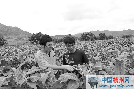 图为日前石城县丰山乡福村包村农技员黄嘉勋(左)在对烟叶种植示范户刘守和进行黄叶病预防指导。黄丽娜 摄