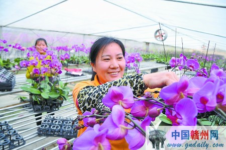 全南县赣江源生态经济示范园是集苗木繁育、苗木种植、芳香产品研发、旅游观光等于一体的生态农林项目。图为工人在示范园里为蝴蝶兰整枝。