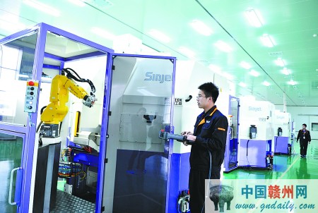 赣州澳克泰工具技术有限公司技术人员在操控高端硬质合金生产线上的自动化机械手臂。