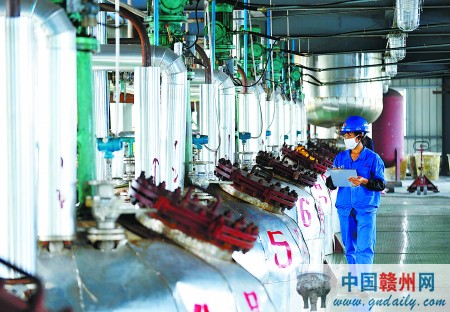 工人在位于宁都县工业园的江西亨通科技发展有限公司生产车间内巡查设备运转情况。据了解,该公司主要生产对叔丁基苯甲酸等紫外线吸收剂,产品广泛应用于工业复配添加、化妆品、药品、香精香料等领域。