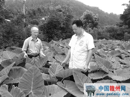 黄家章(右)在“实验田”察看菜芋长势情况。 |