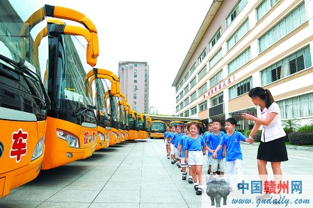 2012年,市政府出台《赣州市校车安全管理实施细则》,市县两级财政为每辆新购置的校车发放补助。图为孩子们在老师的带领下参观学校新购置的校车。