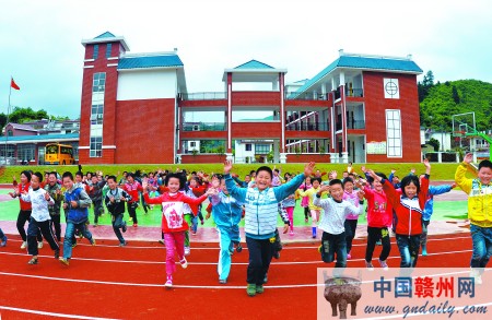 《若干意见》出台实施后,我市不断加大教育投入,把改善学校办学条件作为民生工程的重点来抓,大力实施农村学校的新(改、扩)建工作。图为崇义县关田镇田心村田心小学的孩子们在崭新的校园里快乐地奔跑。(资料图片)
